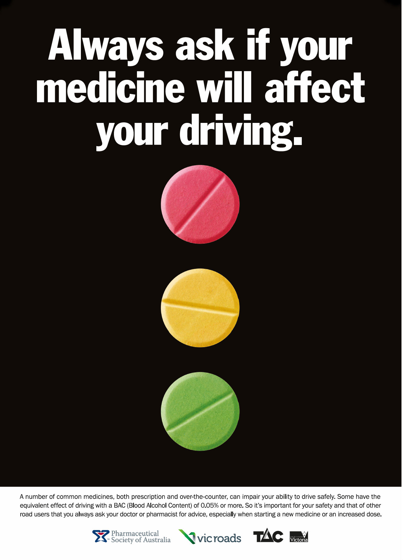 Educating drivers and riders about the effects and risks associated with driving and taking prescription medications is a key goal of the Victorian Government's Road Safety Action Plan 2013-16. For more details visit www.roadsafety.vic.gov.au