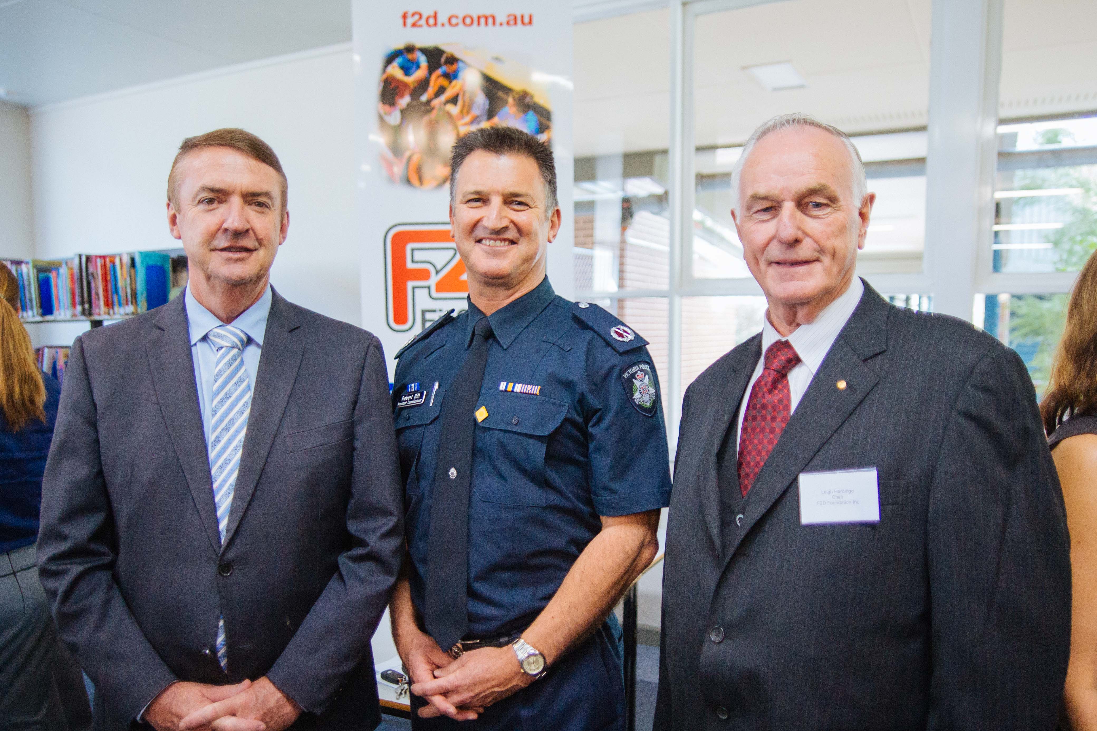 Minister for Roads Terry Mulder, Assistant police commissioner Robert Hill, F2D Foundation Secretary Graham Spencer.