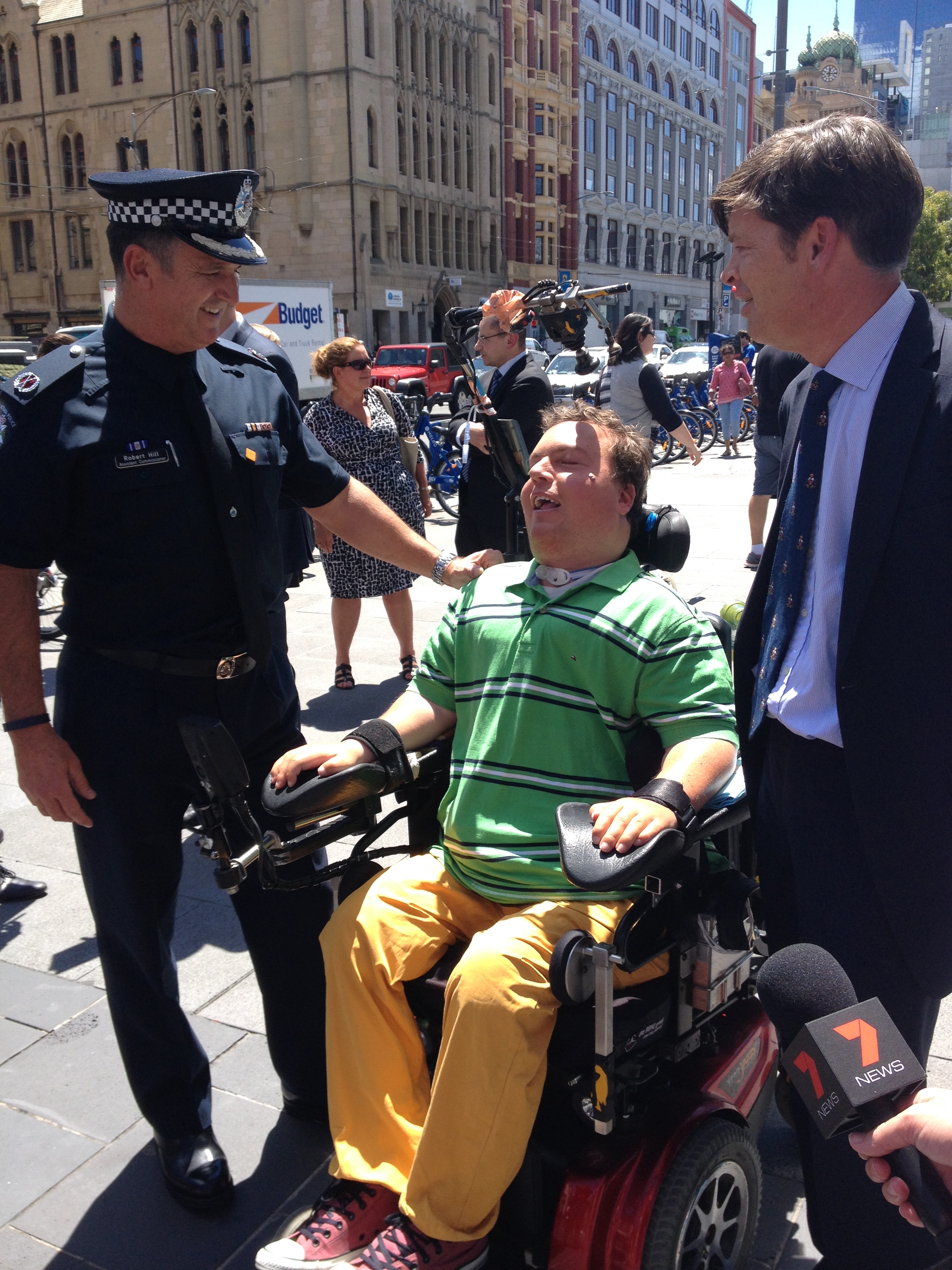 Minister for Roads and Road Safety Luke Donnellan, TAC client Anthony Bartl and Assistant Commissioner for Road Policing Robert Hill