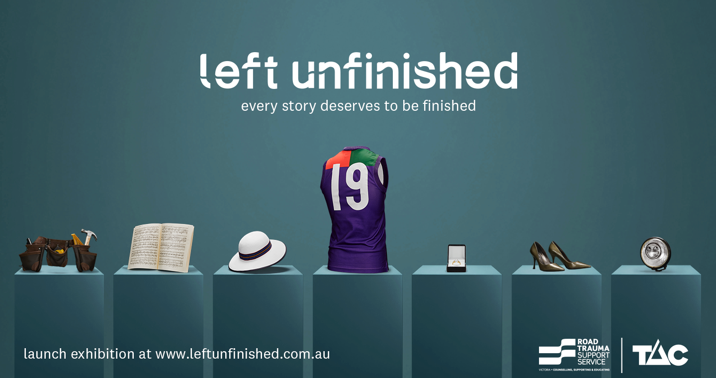 Road Trauma Support Services Victoria and the Transport Accident Commission have developed the campaign ‘Left Unfinished’, which tells the story of seven Victorians who either lost their lives or had their lives permanently changed due to road trauma, and the seemingly ordinary items they left behind or unfinished.