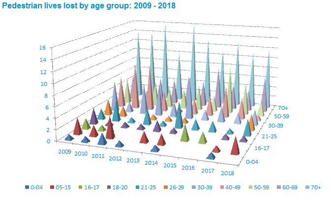 In the last 10 years, more than 400 pedestrians lost their lives on Victorian roads, with one third of pedestrians who lost their lives aged 70 years or over. Most (74%) lost their lives in Metropolitan Melbourne, and most (67%) were male.